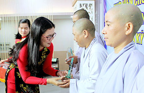Chủ tịch Hội LHPN tỉnh Lê Thị Ngọc Loan khen thưởng các phụ nữ tôn giáo tiêu biểu.
