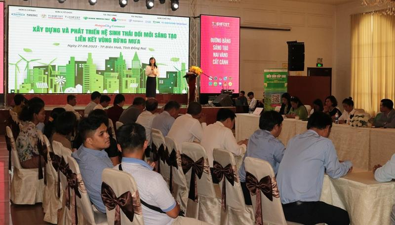 (CTT - Đồng Nai) - Trong khuôn khổ chương trình Techfets Dong Nai 2023, Làng Tư duy thiết kế đổi mới sáng tạo – Techfest Quốc gia đã tổ chức diễn đàn Xây dựng và phát triển hệ sinh thái đổi mới sáng tạo liên kết vùng Rừng mưa.