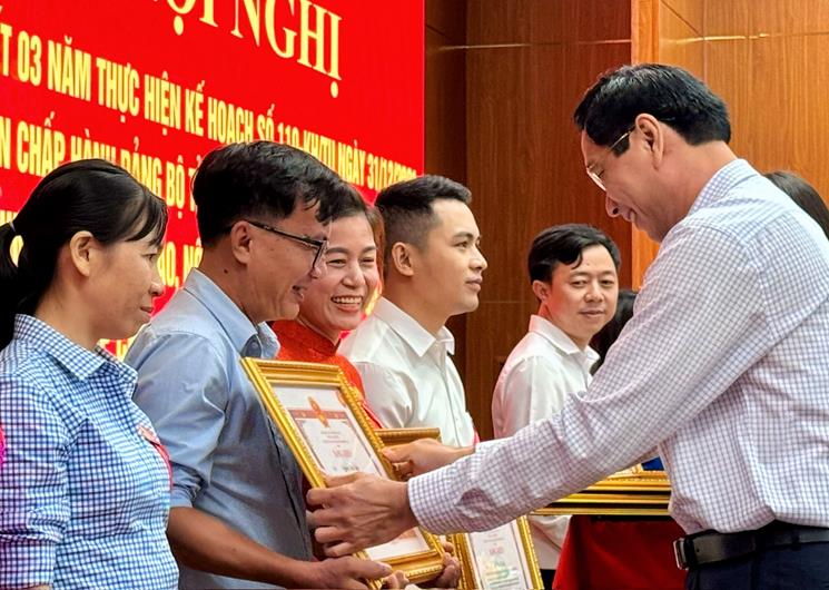 Phó Bí thư thường trực Tỉnh ủy Hồ Thanh Sơn trao bằng khen của UBND tỉnh cho các tập thể có thành tích xuất sắc trong thực hiện Kế hoạch số 110-KH/TU của Ban Chấp hành Đảng bộ tỉnh.