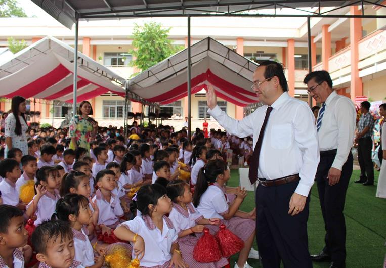 Phó Bí thư Tỉnh ủy Quản Minh Cường trò chuyện với các em học sinh tại buổi lễ khai giảng