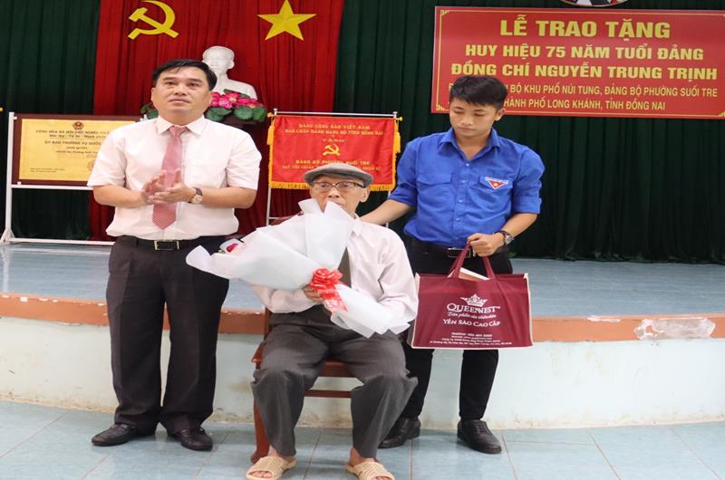Chiều 19-7, đồng chí Quản Minh Cường, Phó bí thư Tỉnh ủy, Trưởng đoàn đại biểu Quốc hội tỉnh đến trao tặng Huy hiệu 75 năm tuổi Đảng cho đồng chí Nguyễn Trung Trịnh, đảng viên Chi bộ KP.Núi Tung, Đảng bộ P.Suối Tre (thuộc Đảng bộ TP.Long Khánh). Cùng dự có các đồng chí: Bùi Thị Yến, Phó Trưởng ban Thường trực Ban Tổ chức Tỉnh ủy và Hồ Văn Nam, Bí thư Thành ủy Long Khánh.