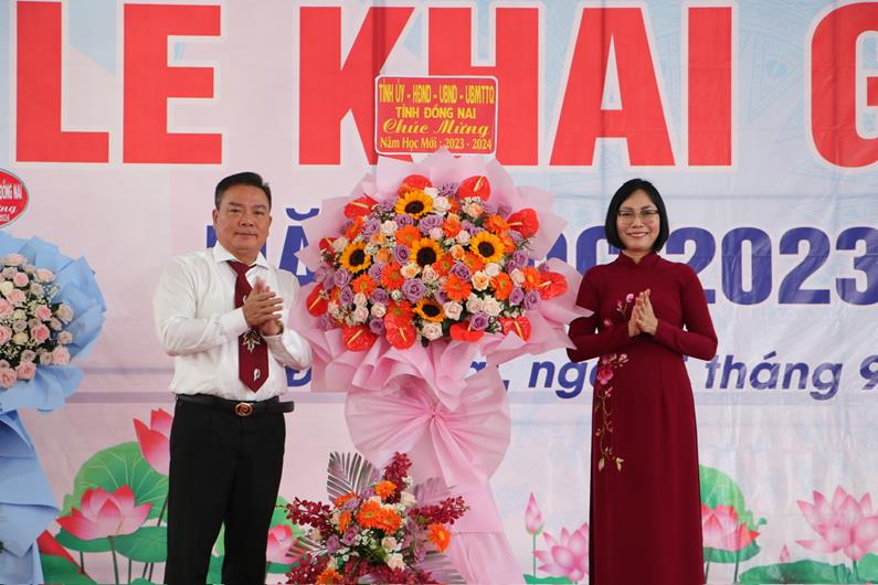 Phó Chủ tịch UBND tỉnh Nguyễn Thị Hoàng trao tặng lẵng hoa chúc mừng của Tỉnh ủy - HĐND - UBND - UBMTTQ Việt Nam tỉnh nhân dịp năm học mới.