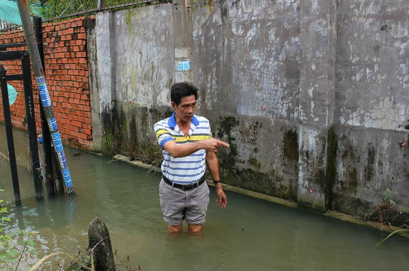 Cùng tuyến đường với nhà ông Quân, ngày 9-9 vừa qua, dù không mưa nhưng hàng chục hộ gia đình vẫn phải lội nước vào nhà. Theo người dân, khu vực này trũng thấp, không có hệ thống mương thoát nước dọc đường, thêm vào những căn nhà xây dựng sau này đôn móng cao tránh ngập và tác động của dự án Khu dân cư An Hưng Phát đã bít lối thoát nước ra sông, dẫn đến tình trạng mưa lớn, mưa nhỏ, thậm chí không mưa cũng ngập. Bà Nguyễn Thị Hải (ngụ tổ 3, KP.Miễu) chia sẻ, khu vực này từ cuối tháng 7 đến nay liên tục xảy ra ngập nước. Cao điểm mưa lớn các ngày 6 và 7-9 vừa qua, nước ngập sâu, gia đình bà phải di chuyển tài sản đi nơi khác, bị cắt điện, con phải nghỉ học.