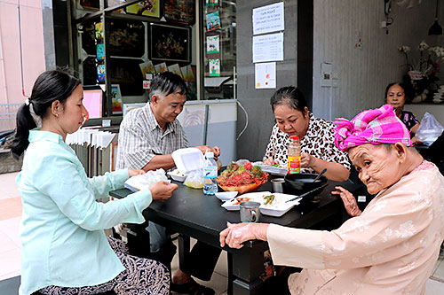 Khoảng 10 giờ 15, khách bắt đầu đến Quán cơm nhân ái ngày càng đông. Khách của quán hầu hết là những người nghèo, có hoàn cảnh khó khăn như: người đạp xích lô, bán vé số dạo, trẻ em đánh giày, chị nhặt ve chai… Bà Dương Thị Tư (82 tuổi) bộc bạch: “Đã lâu lắm rồi tôi mới được ăn một bữa cơm ngon như vậy…”. Trước đây, bà Tư cũng từng có một gia đình đầm ấm và hạnh phúc, nhưng rồi các con của bà làm ăn thất bại khiến gia đình rơi vào cảnh… “màn trời chiếu đất”. Hiện bà đang ở cùng với người con gái, cuộc sống rất khó khăn. Không muốn là gánh nặng cho con, nhiều năm qua bà Tư đi bán vé số dạo kiếm tiền tự lo cho bản thân.