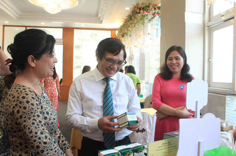 Phó Chủ tịch UBND tỉnh Nguyễn Sơn Hùng (giữa) tham quan các gian hàng trưng bày sản phẩm khởi nghiệp của phụ nữ