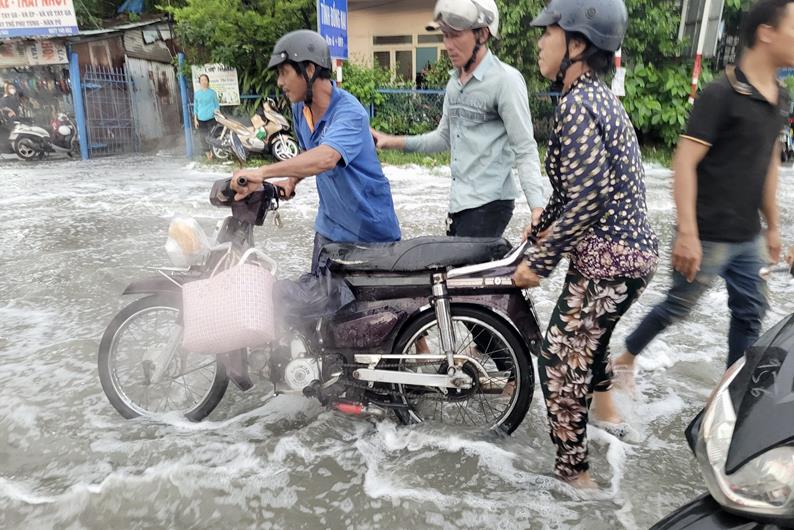 Do tình trạng ngập xảy ra vào giờ cao điểm nên lượng xe đi qua khu vực này rất đông, dẫn tới ùn tắc cục bộ. Nhiều nơi nước ngập 30 - 40cm khiến hàng chục người đi xe máy phải dắt bộ để vượt qua điểm ngập.