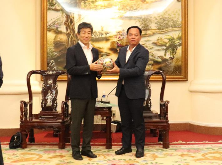 Quyền Chủ tịch UBND tỉnh Võ Tấn Đức tặng quà lưu niệm cho ông Nakagawa Tetsuyuki nhân chuyến làm việc tại Đồng Nai