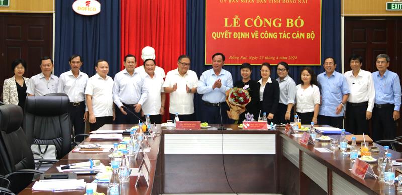 Quyền Chủ tịch UBND tỉnh Võ Tấn Đức và lãnh đạo tỉnh các sở, ngành tặng hoa chúc mừng bà Đỗ Thị Thu Hằng được bổ nhiệm giữ chức vụ Hội đồng thành viên Tổng Công ty Dofico