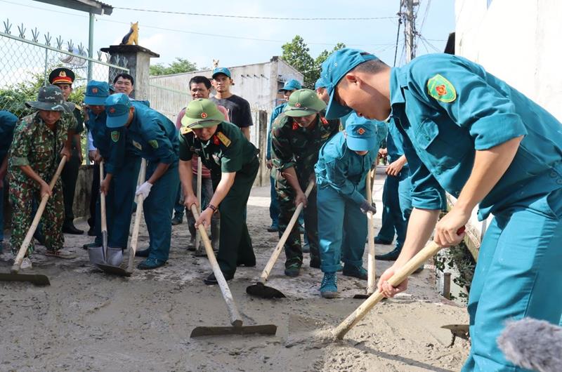 Cán bộ, chiến sĩ lực lượng vũ trang huyện và các ngành thực hiện tuyến đường bê tông hóa ấp Đại Thắng