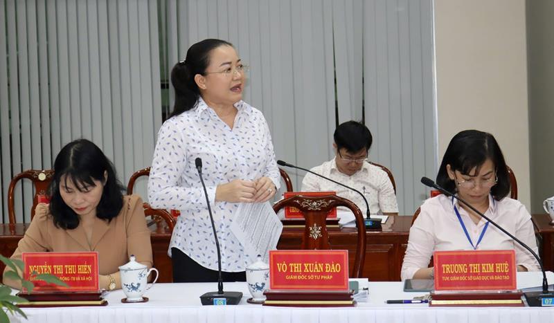 Giám đốc Sở Tư pháp Võ Thị Xuân Đào báo cáo tiến độ xây dựng các tờ trình