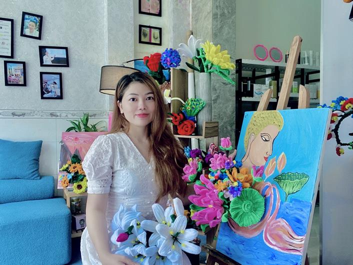 Chị Nguyễn Thị Hồng Nhung (ngụ P.Tân Phong, TP.Biên Hòa) bên những bức tranh kẽm nhung, được giới thiệu qua mạng xã hội