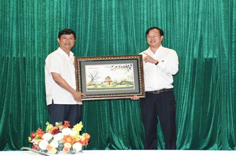 Chủ tịch UBND tỉnh Cao Tiến Dũng (bên phải) tặng bức tranh cho Chủ tịch UBND tỉnh Bình Dương Võ Văn Minh nhân dịp đoàn công tác của tỉnh Bình Dương sang Đồng Nai làm việc về các dự án giao thông kết nối giữa 2 địa phương