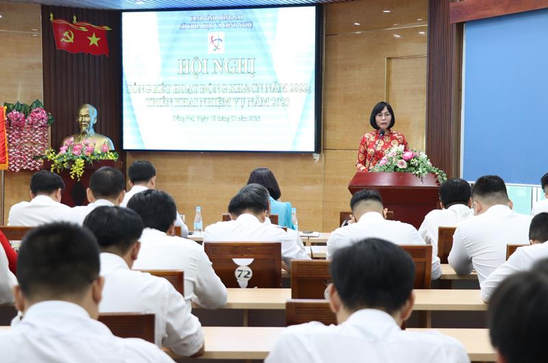Phó Chủ tịch UBND tỉnh Nguyễn Thị Hoàng phát biểu tại hội nghị tổng kết năm 2022 và triển khai nhiệm vụ năm 2023 của Sở KH-CN