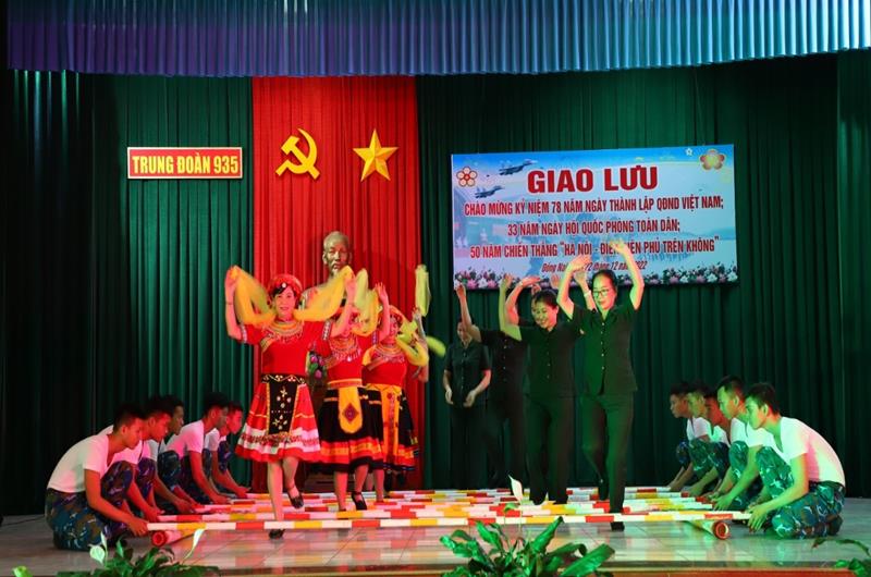Chương trình giao lưu có 13 tiết mục văn nghệ, tiêu biểu như: Ca múa mừng Đảng Cộng sản Việt Nam; đơn ca Người chiến sĩ ấy; song ca Đất nước tình yêu; tam ca Đường chúng ta đi; ca múa Nhớ về Hà Nội; múa nhảy sạp… được các nghệ sĩ, diễn viên của Trung tâm và Trung đoàn 935 biểu diễn.