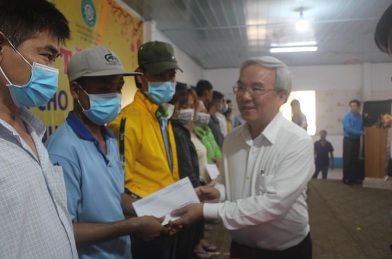 Chủ tịch Ủy ban MTTQ Việt Nam tỉnh Cao Văn Quang trao quà cho công nhân khó khăn