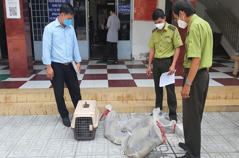 Giám đốc Trung tâm cứu hộ, bảo tồn và phát triển sinh vật (thuộc Vườn quốc gia Cát Tiên) Nguyễn Thế Việt (bên trái) cùng chức năng tiếp nhận các loài ĐVHD