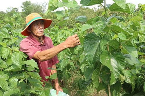 Ông Trần Đức Tùng (ngụ xã Sông Ray, huyện Cẩm Mỹ) bên vườn dâu tằm của gia đình sau khi được học lớp trồng dâu nuôi tằm và vay vốn sản xuất. Ảnh: Văn Truyên