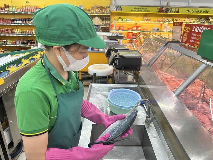 Nhân viên siêu thị chế biến cá để bán cho khách hàng