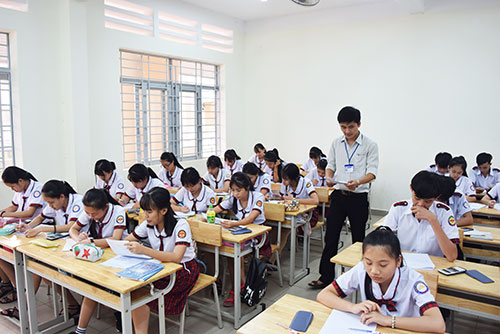 Xây dựng trường đạt chuẩn quốc gia là một trong những biện pháp nhằm chuẩn hóa cơ sở vật chất, đội ngũ giáo viên; từng bước nâng cao chất lượng giáo dục, đáp ứng yêu cầu đổi mới. Trong ảnh: Thầy trò Trường THPT Cẩm Mỹ trong giờ dạy học.