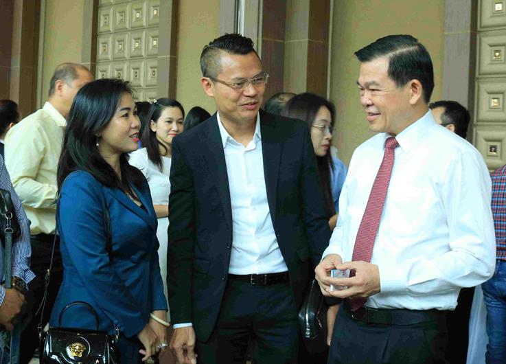 Bí thư Tỉnh ủy Nguyễn Hồng Lĩnh trao đổi với doanh nghiệp bên lề hội nghị