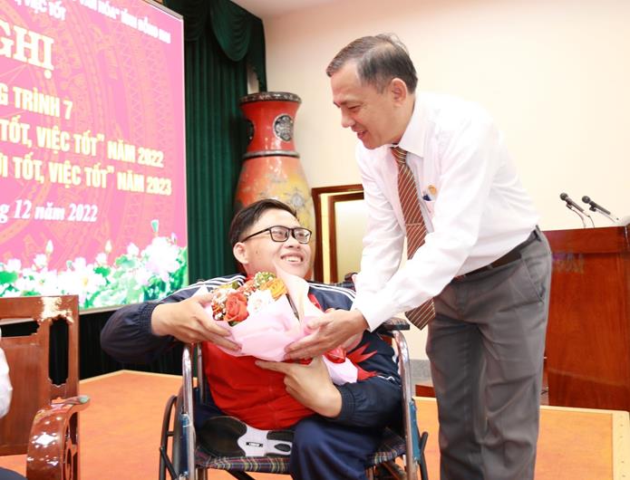 Phó trưởng Ban Tuyên giáo Tỉnh ủy Phạm Tấn Linh tặng hoa chúc mừng anh Huỳnh Ngọc Phụng (NKT, P.Hiệp Hòa, TP.Biên Hòa) - tấm gương người khuyết tật được tuyên dương gương người tốt việc tốt tỉnh Đồng Nai năm 2022.
