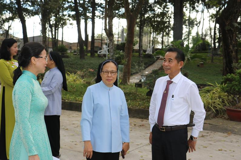 Ủy viên Ban TVTU, Chủ tịch HĐND tỉnh Thái Bảo cùng các nữ tu Nữ Đan viện Xitô Thánh Mẫu Vĩnh Phước (P.Tân Hòa, TP.Biên Hòa) tham quan vườn cây xanh tại đan viện