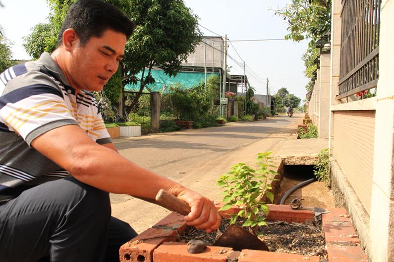 Ông Trần Chí Dũng, Trưởng ban Công tác Mặt trận ấp Đức Long 3, xã Gia Tân 2, H.Thống Nhất chăm sóc một bồn hoa ven đường khu dân cư