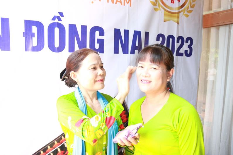 NCT H.Định Quán chăm chút cho nhau trước giờ lên sân khấu biểu diễn tại Liên hoan Tiếng hát NCT tỉnh Đồng Nai năm 2023