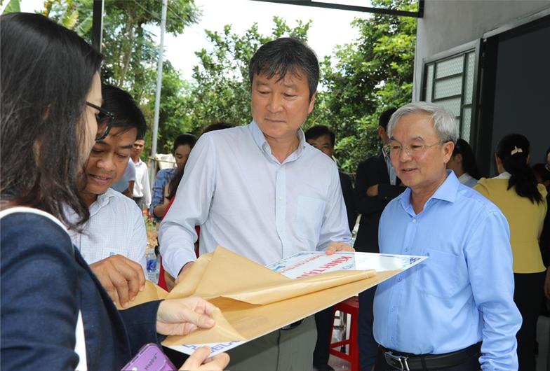 Chủ tịch Ủy ban MTTQ Việt Nam tỉnh Cao Văn Quang cùng lãnh đạo Hiệp hội các Doanh nghiệp Hàn Quốc tại Đồng Nai gắn bảng trao nhà cho người dân huyện Tân Phú.