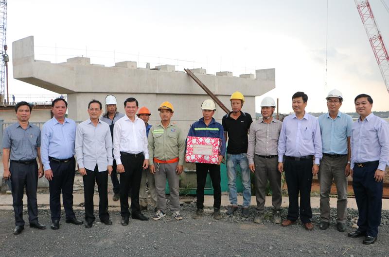 Bí thư Tỉnh ủy Nguyễn Hồng Lĩnh tặng quà lực lượng thi công dự án cầu Vàm Cái Sứt
