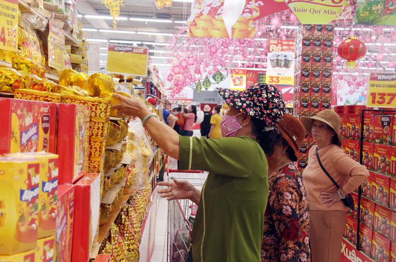 Người tiêu dùng chọn mua các loại bánh kẹo Tết tại một siêu thị ở TP.Biên Hòa