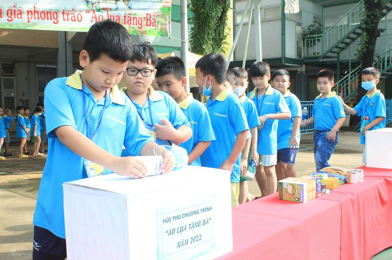 Các em thiếu nhi tham gia đóng góp cho phong trào Áo lụa tặng bà