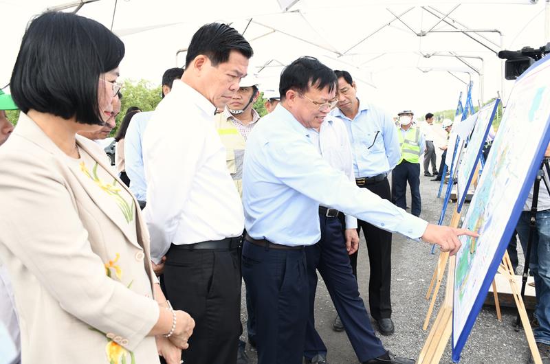 Bí thư Tỉnh ủy Nguyễn Hồng Lĩnh (thứ 2 từ trái qua) cùng Chủ tịch UBND tỉnh Cao Tiến Dũng (thứ 3 từ trái qua), Phó Chủ tịch UBND tỉnh Nguyễn Thị Hoàng (ngoài cùng bên trái) và Phó Chủ tịch UBND tỉnh Võ Văn Phi (ngoài cùng bên phải) kiểm tra thực địa dự án cao tốc Bến Lức - Long Thành đoạn qua địa phận Đồng Nai