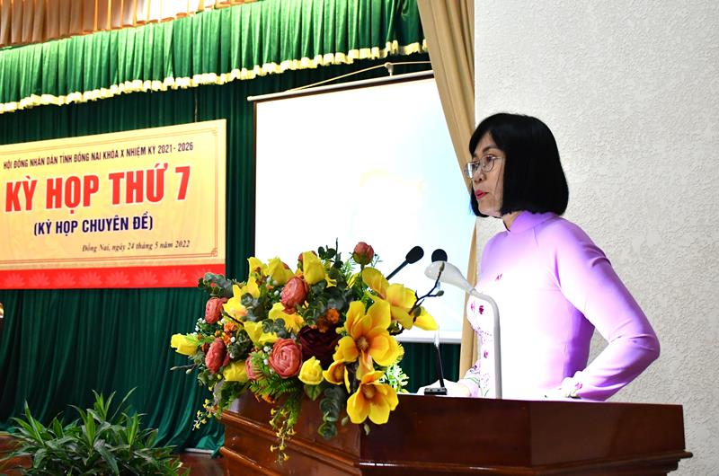 Phó chủ tịch UBND tỉnh Nguyễn Thị Hoàng báo cáo tờ trình tại cuộc họp