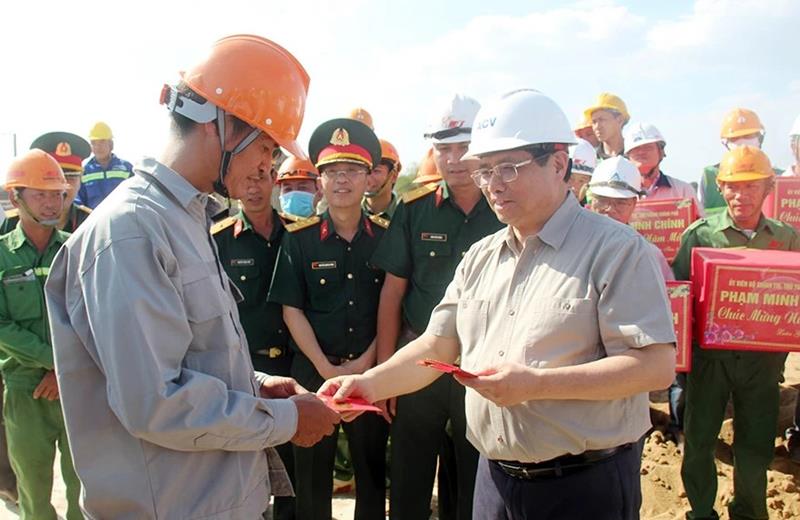 Thủ tướng Phạm Minh Chính lì xì cho công nhân thi công tuyến đường cao tốc Biên Hòa-Vũng Tàu trong dịp tết