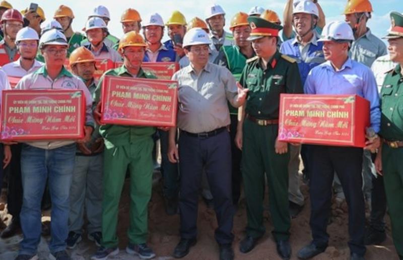 Thủ tướng Phạm Minh Chính tặng quà cho đơn vị thi công tuyến đường cao tốc Biên Hòa-Vũng Tàu trong dịp tết