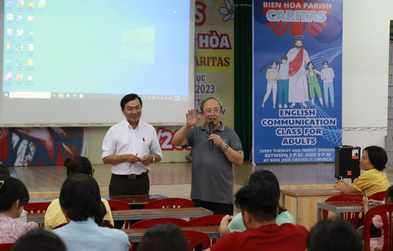 Linh mục Chánh xứ giáo xứ Biên Hòa Trần Công Hiển trao đổi cùng các học viên tham gia lớp tiếng Anh do giáo xứ tổ chức