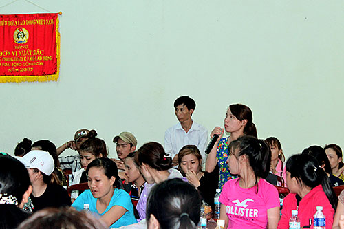 Tại buổi đối thoại, công nhân tập trung vào các câu hỏi liên quan đến lương và các chế độ chính sách như: chế độ thai sản cho nữ công nhân đang mang thai, chế độ bảo hiểm thất nghiệp, vấn đề chốt sổ BHXH cho công nhân, tìm việc làm cho công nhân lớn tuổi và việc tiếp tục giải quyết 50% lương tháng 1-2018 cho công nhân…