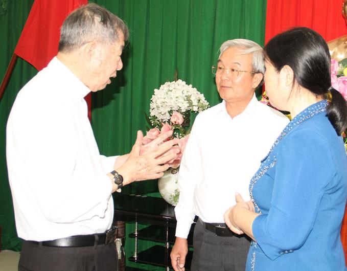 Chủ tịch Ủy ban MTTQ Việt Nam tỉnh Cao Văn Quang trao đổi cùng các đại biểu Ủy ban ĐKCGVN tỉnh.