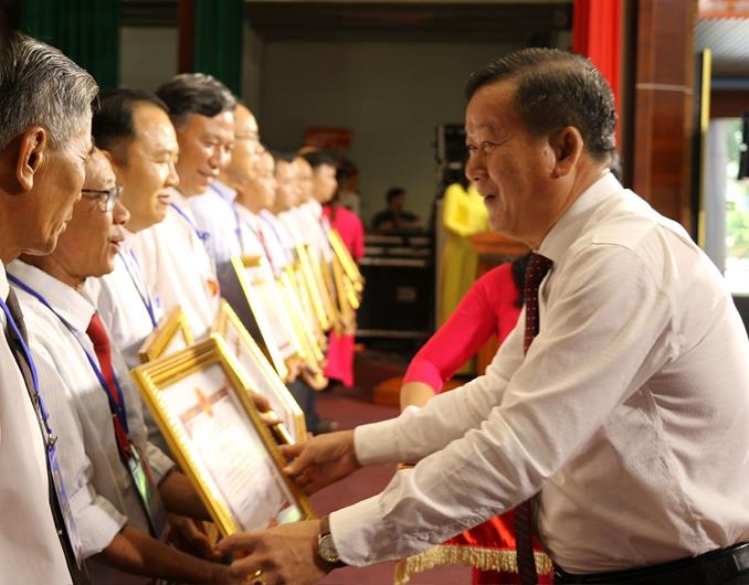 Đ/c Đào Văn Phước, Ủy viên Ban TVTU, Trưởng Ban Dân vận Tỉnh ủy trao bằng khen của UBND tỉnh cho tập thể, cá nhân Ủy ban ĐKCGVN tỉnh có thành tích xuất sắc trong nhiệm kỳ vừa qua.