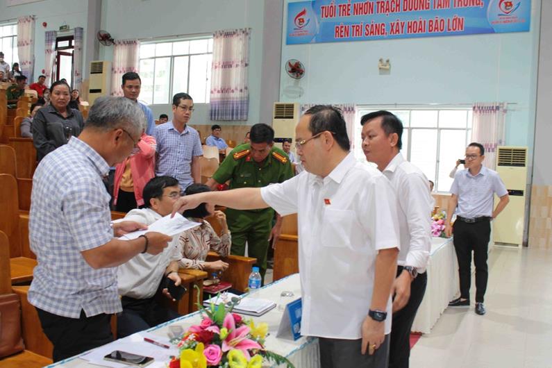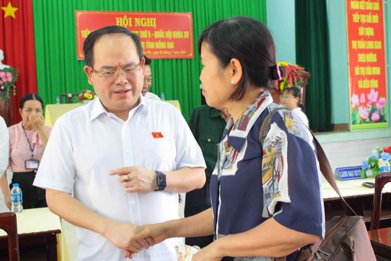 Phó Bí thư Tỉnh ủy, Trưởng Đoàn đại biểu Quốc hội tỉnh Quản Minh Cường trao đổi làm rõ về một vụ việc cụ thể tại hội nghị tiếp xúc cử tri Nhơn Trạch sau Kỳ họp thứ 5, Quốc hội XV