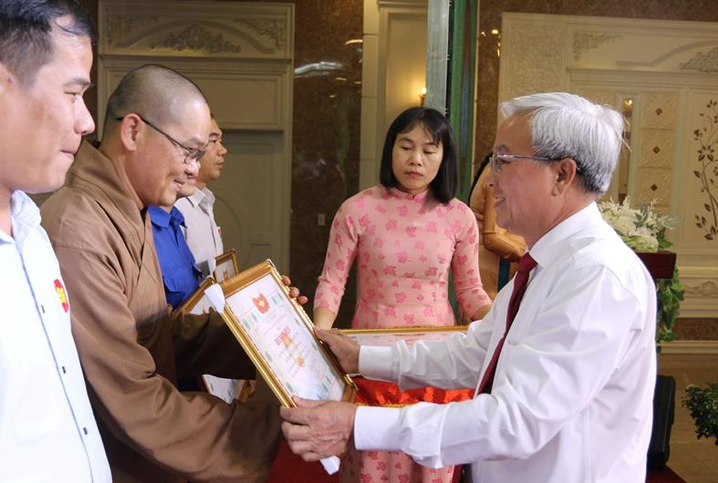 Ủy viên Ban TVTU, Chủ tịch Ủy ban MTTQ Việt Nam tỉnh Cao Văn Quang khen thưởng các cá nhân, tập thể tại hội nghị
