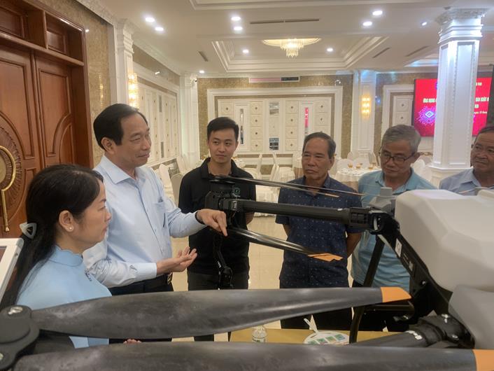 Phó Chủ tịch UBND tỉnh Võ Văn Phi tham quan mô hình máy bay không người lái trong sản xuất nông nghiệp tại hội thảo