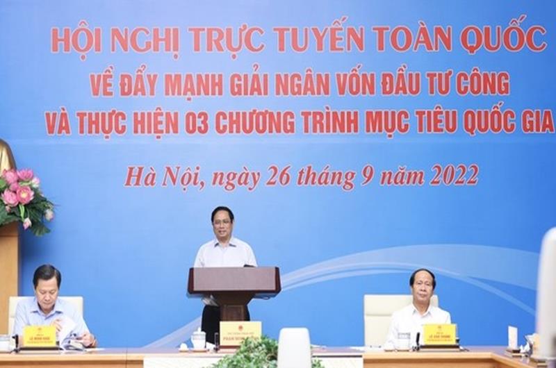 TTĐT - Sáng ngày 26/9, Thủ tướng Phạm Minh Chính chủ trì Hội nghị trực tuyến toàn quốc về đẩy mạnh giải ngân vốn đầu tư công và thực hiện 3 chương trình mục tiêu quốc gia. Cùng dự tại điểm cầu trụ sở Chính phủ có Phó Thủ tướng Lê Minh Khái, Phó Thủ tướng Lê Văn Thành; lãnh đạo các bộ, ngành, cơ quan Trung ương.