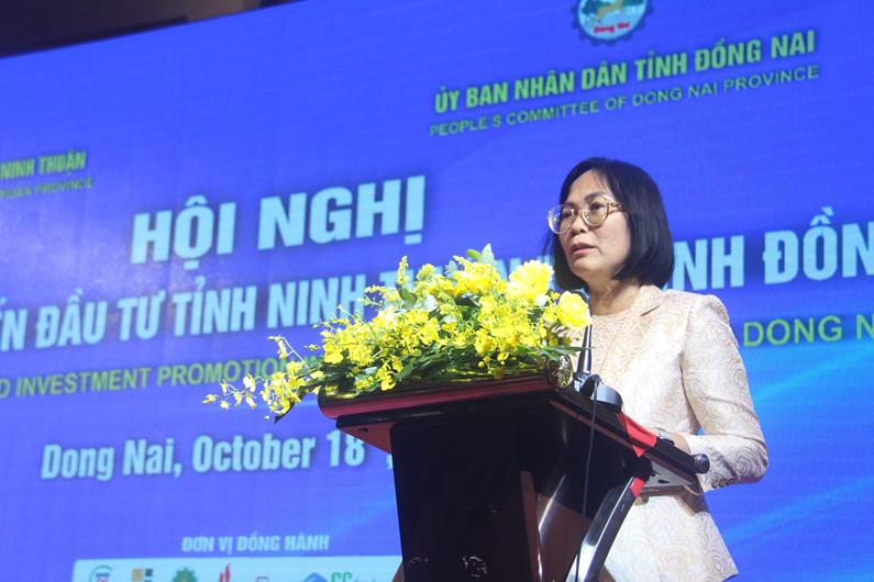 Phó Chủ tịch UBND tỉnh Đồng Nai Nguyễn Thị Hoàng chia sẻ, trong quá trình phát triển kinh tế, tỉnh Đồng Nai luôn xác định muốn phát triển nhanh, bền vững thì phải có sự gắn kết với các tỉnh. Các doanh nghiệp đã đầu tư, hoạt động sản xuất kinh doanh ổn định và hiệu quả tại tỉnh Đồng Nai thì cần nghiên cứu đầu tư, mở rộng thêm vào các địa phương lân cận, đây chính là cơ hội để phát triển cho chính doanh nghiệp mình, vừa góp phần thúc đẩy mối quan hệ hợp tác phát triển bền vững giữa tỉnh Đồng Nai và tỉnh Ninh Thuận.