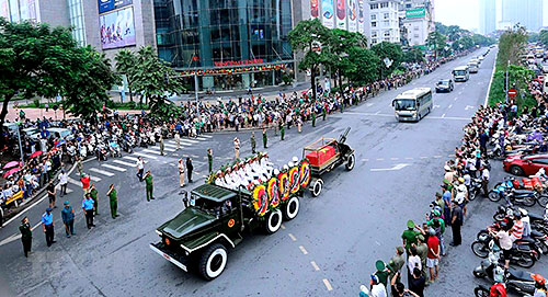 Đoàn xe tang Chủ tịch nước Trần Đại Quang di chuyển trên đường Nguyễn Chí Thanh, Hà Nội, sáng 27-9.