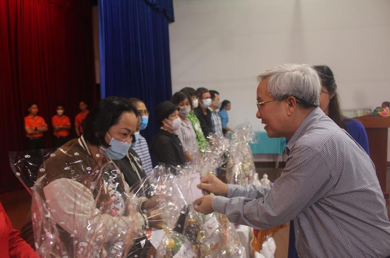 Chủ tịch Ủy ban MTTQ Việt Nam tỉnh Cao Văn Quang trao quà cho công nhân