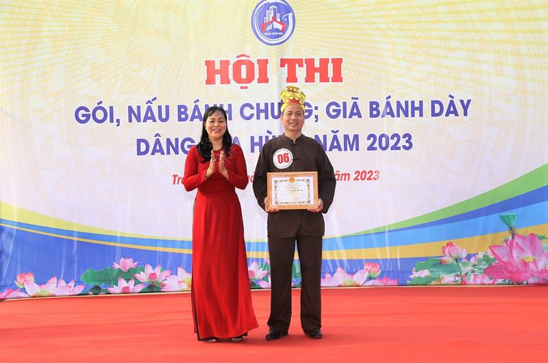 Ban tổ chức trao giải nhất cho các đơn vị tham gia Hội thi Gói, nấu bánh chưng, giã bánh giầy dâng Vua Hùng 2023