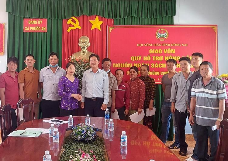 Bà Hồ Thị Sự - Phó Chủ tịch Thường trực Hội Nông dân tỉnh (áo tím) trao vốn cho Dự án “Nuôi tôm quảng canh” tại xã Phước An