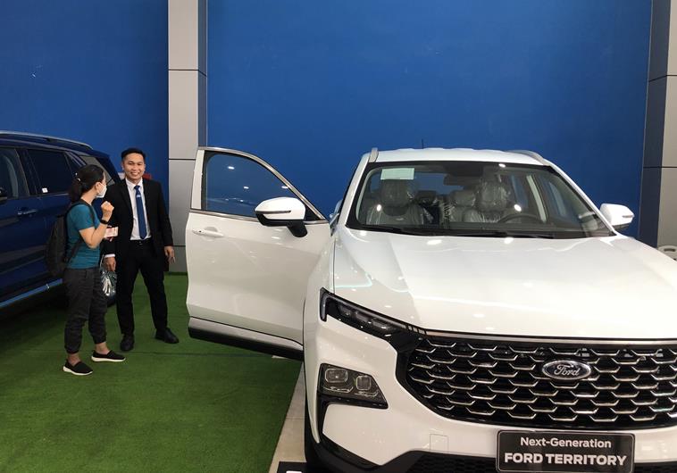 Người dân tham khảo các mẫu xe được sản xuất, láp ráp trong nước tại một đại lý ô tô ở TP.Biên Hòa